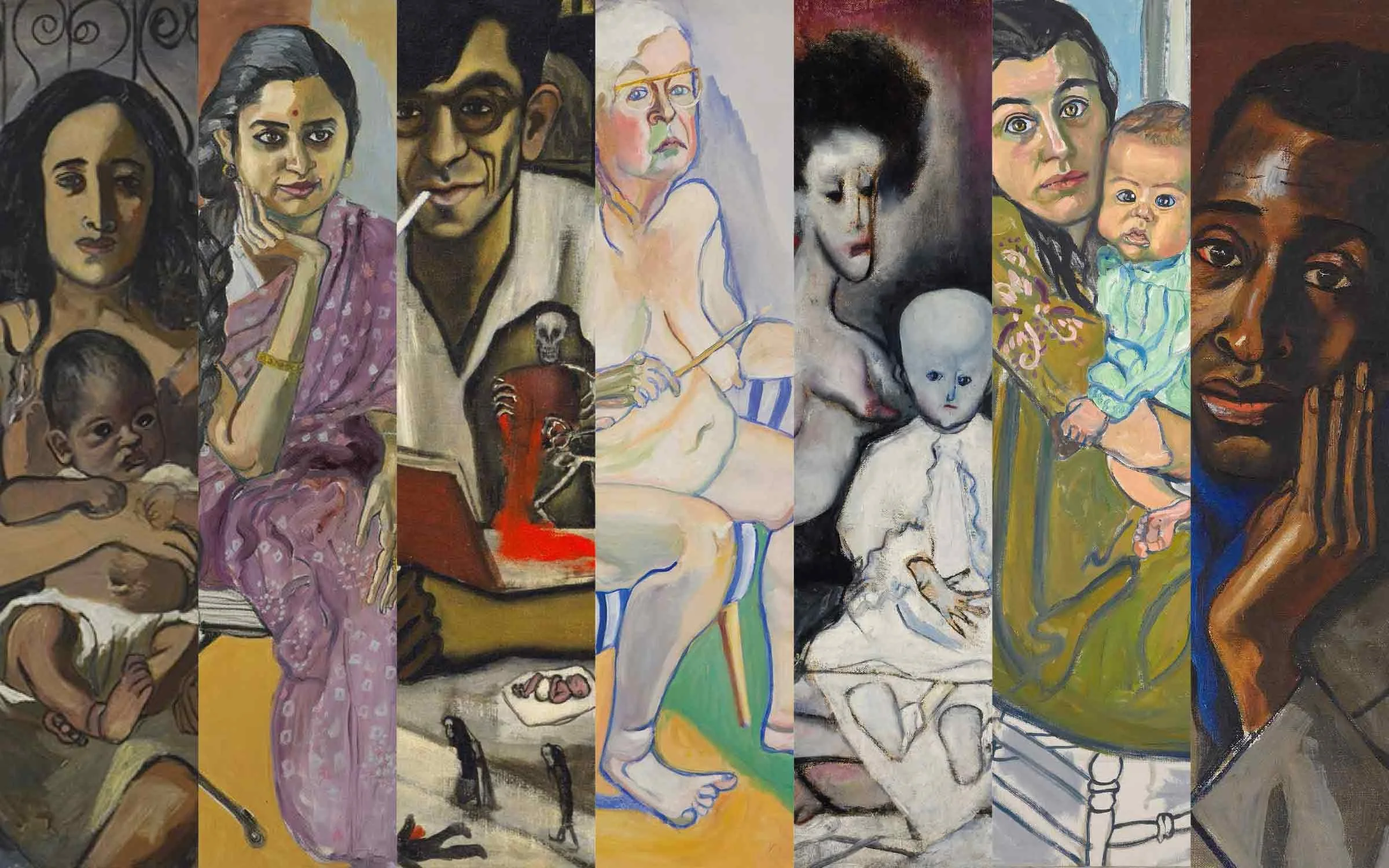 Collage of Alice Neel portraits spanning her career, featuring mothers with children, intimate figure studies, and expressive depictions of diverse sitters.
